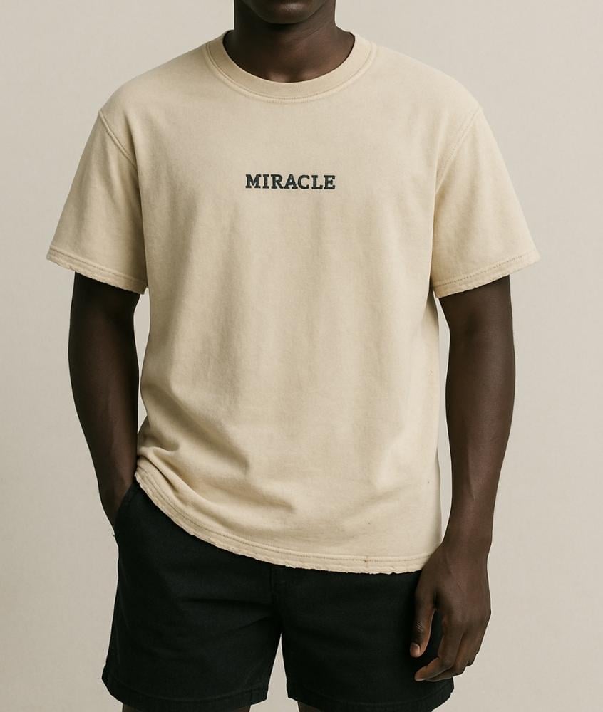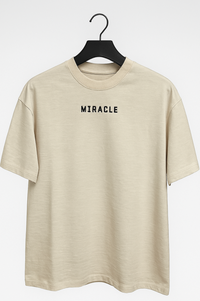 في منتصف الصدر، تطريز أنيق بكلمة MIRACLE بخيوط سوداء، يمنح التيشيرت لمسة فريدة دون تعقيد.